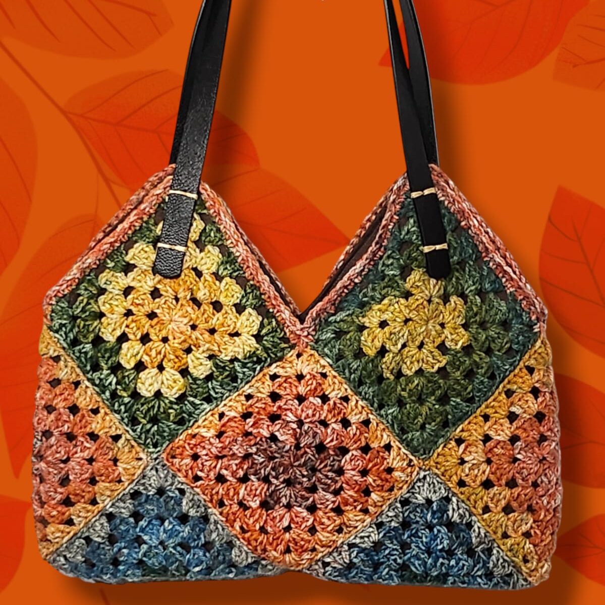 Diez grannys forman este original bolso, con forro interior, asas de cuero negro y cerrado con cremallera.